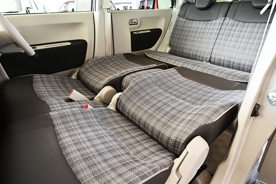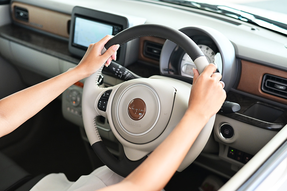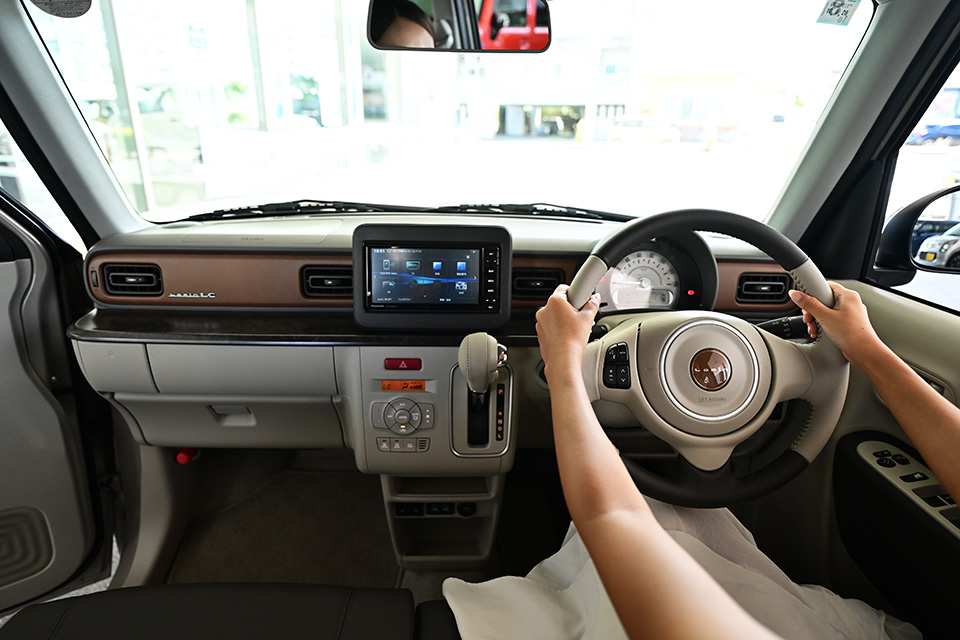 ラパンの室内は、乗る人の気持ちに寄り添うデザインが満載。木目調のインパネやファブリック素材のシートが、やさしくて落ち着いた雰囲気を演出してくれます。
