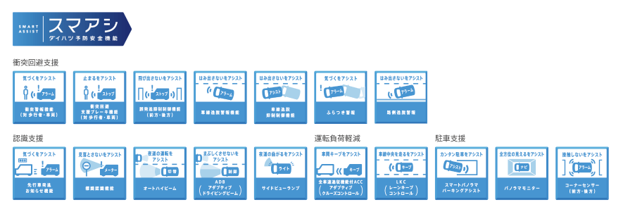 ダイハツの「スマートアシスト」は、カメラやセンサーが周囲を検知し、衝突回避や踏み間違いの防止を手助けする先進技術です。前方の車両や歩行者を検知して危険がある場合、自動でブレーキを作動。誤発進抑制や車線逸脱警報などの多彩な機能で、日常の運転を安心して楽しめます。